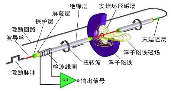 磁致伸縮液位計主要由電子部件、磁致伸縮波導絲、浮子等部分組成。測量時,電子部件產生一個電流“激勵”脈沖,該脈沖電流以光速沿波導絲向下運行,并在波導絲周圍形成周向安培環形磁場。當激勵脈沖電流產生的環形磁場與浮子內永磁鐵產生的偏置磁場相遇時,浮子周圍的磁場發生改變,從而使得由磁致伸縮材料做成的波導絲在浮子所在的位置產生一個感應扭轉波脈沖,該扭轉波以聲速由產生點向波導絲的兩端傳播,傳向末端的扭轉波被阻尼器件吸收,傳向激勵端的信號則被檢波裝置接收,并由電子部件測量出脈沖電流與扭轉波的時間差,再乘以扭轉波在波導絲中的傳播速度(固定量為2800m/s),即可計算出浮子產生扭轉波的位置與測量基準點間的距離,也就是液面的位置。磁致伸縮液位計傳感器原理見下圖。